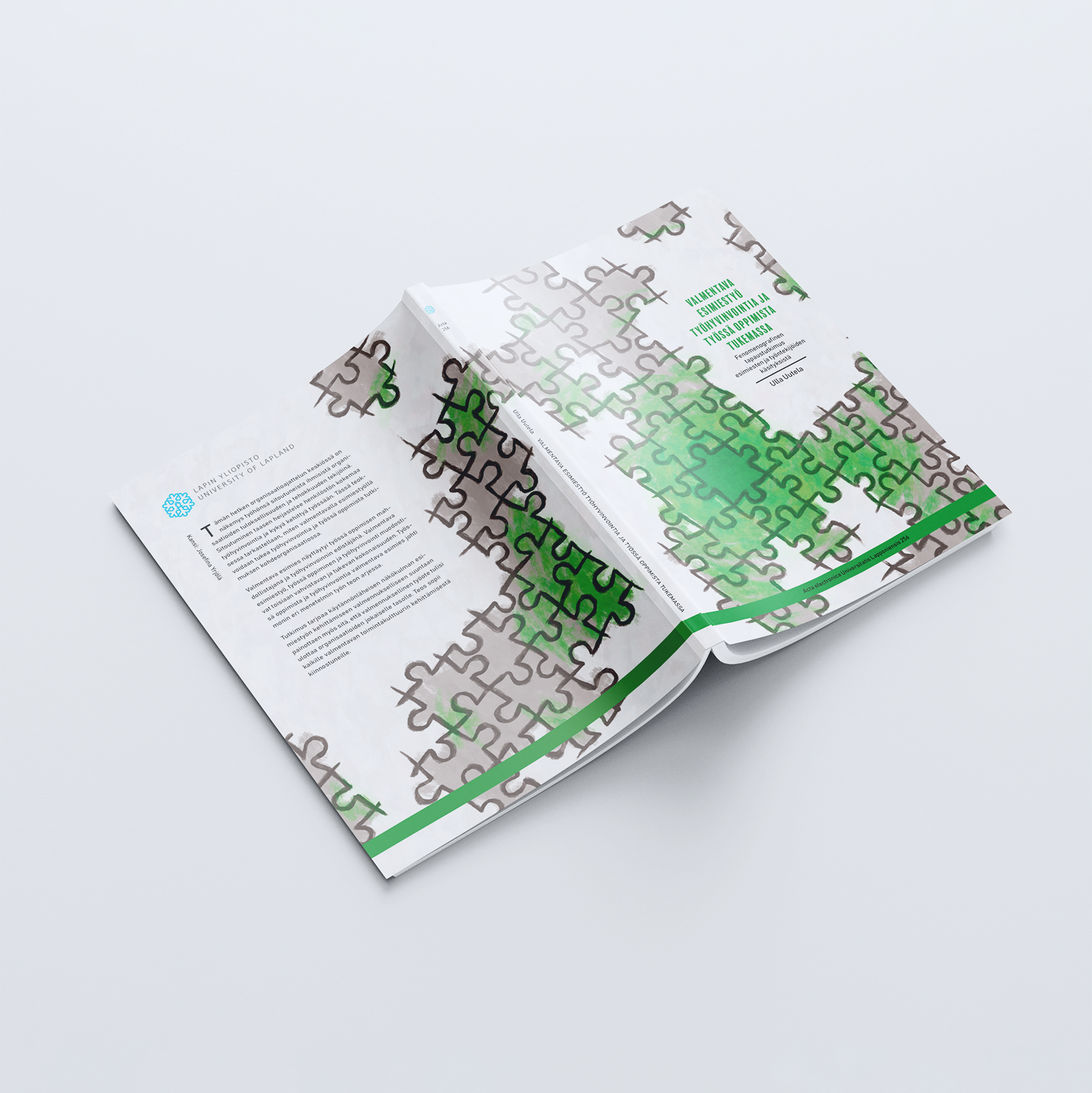 Ulla Uutela wrote in her thesis how coaching leadership style supports well-being and learning at work. I depicted the idea of that positive influence through puzzle pieces spanning across the front and back covers.