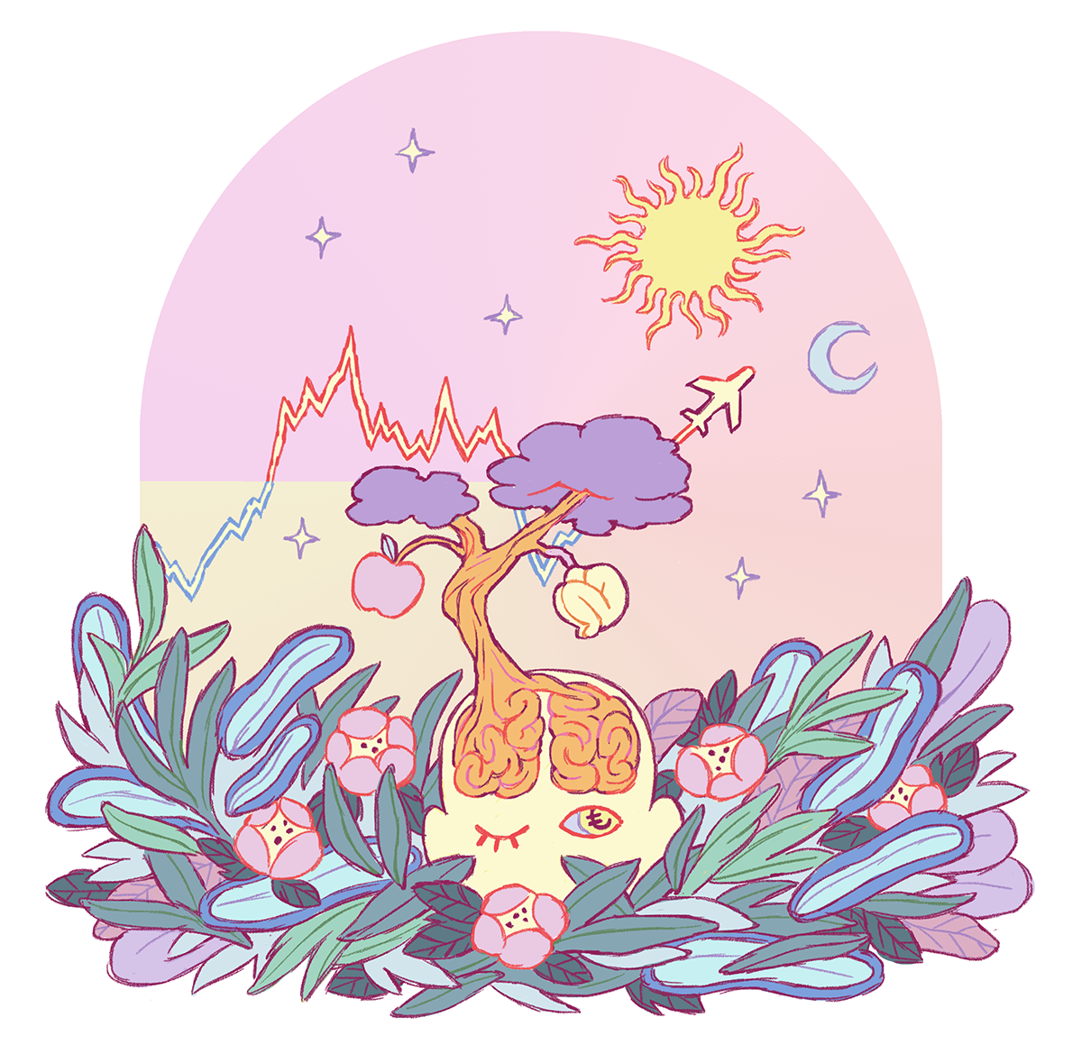 The first image is for an essay depicting ideas of the relationships between people, nature and consumption from a philosophical standpoint, so I wanted the illustration to feel a little surrealistic. Light colours balanced the heaviness of the topic. Handmade brush strokes made it seem more approachable and reminded of people’s part in it.