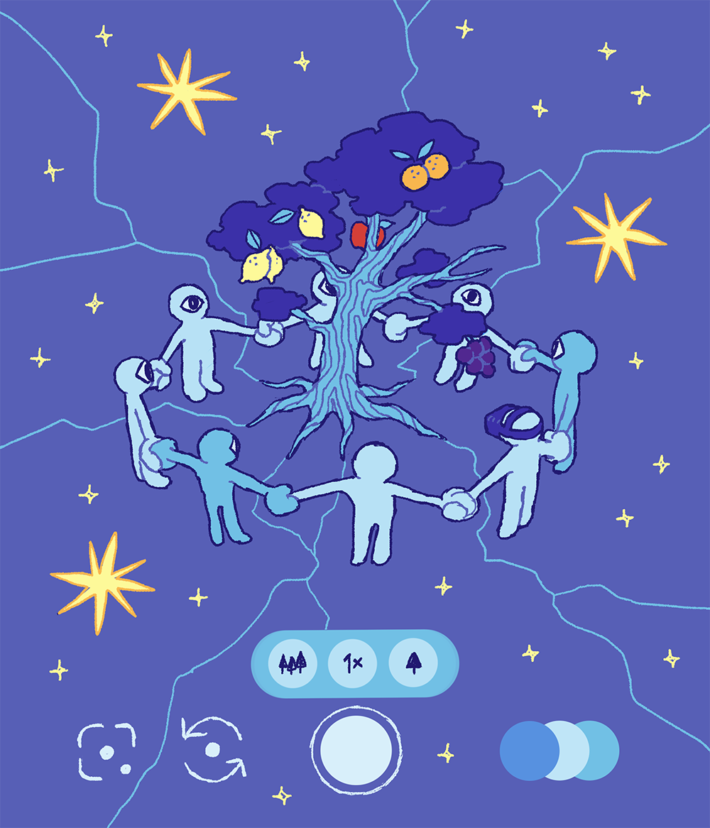 The second illustration is a cover image for an issue released in the fall when new students roll in. I asked the chief editor what themes were going to be prevalent, since I wanted the illustration to cover them as well as possible. They were community, points of view, technology and the university itself, which is how I ended up with a recording screen and in it a circle of little fellas all looking from their points of view the tree of knowledge, aka the university and all the different fruits it grows in different directions.