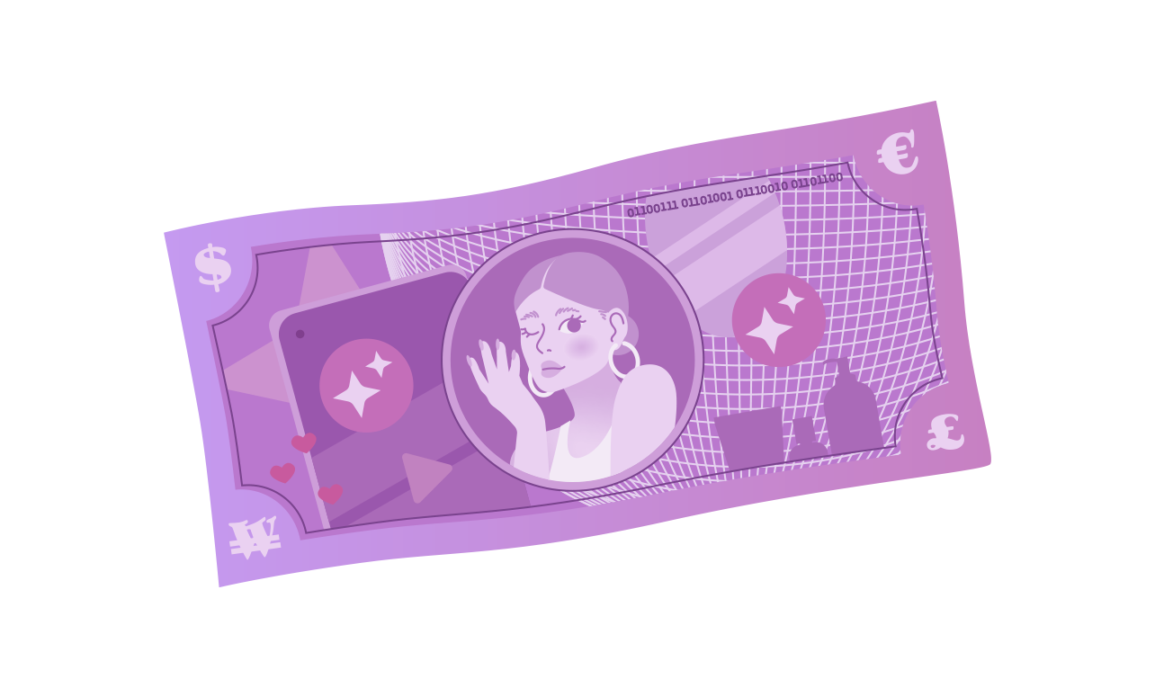 The third illustration was for an essay about trending girl aesthetics, especially the clean girl aesthetic, and consumerism. One must have money to be able to follow trends and fashion trends often target girls as was the focus in the essay, so in the illustration I placed a girl in the traditional place of an older man’s head on bill. The surrounding imagery depicts global influence and means of validation.